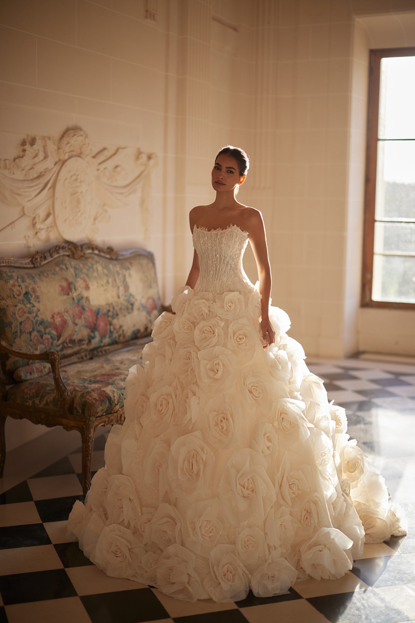 O rochie transformabilă de lux, cu mai multe elemente detașabile. Corsetul structurat, alungit, cu linii verticale chic, este confecționat din dantelă și decorat cu dantelă Chantilly și pietre strălucitoare. Are șnururi la spate. Sofisticat și feminin, look-ul poate fi asortat cu două opțiuni de fustă. Prima este o fustă semitransparentă care accentuează silueta, confecționată din dantelă Chantilly brodată, având o trenă mică și un croi înalt. A doua este o fustă voluminoasă, realizată din tul și dantelă Chantilly de culoare nude. Este împodobită cu flori lucrate manual din dantelă, tul și organza. Are o trenă lungă.
